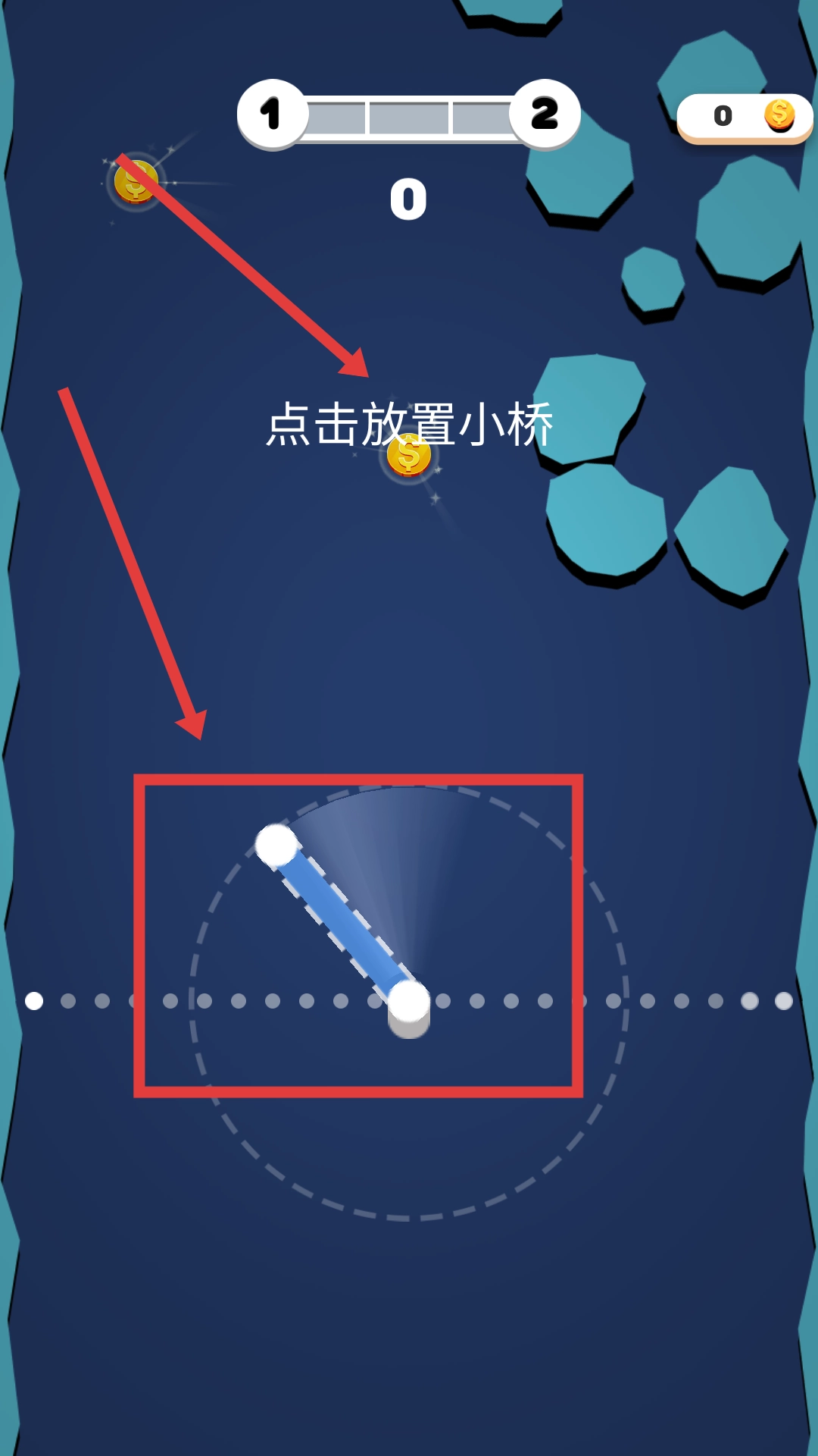 游戏开始时,根据点击放置小桥的提示,观察金币的位置和路径走向,在恰当的位置点击放置小桥组件,搭建出连通的路径,使角色可以顺利收集到金币。