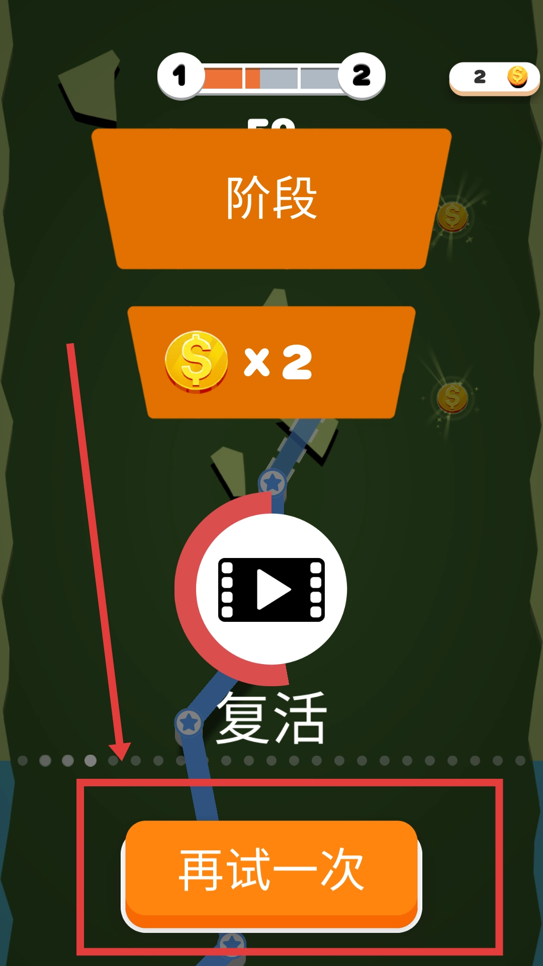 当挑战失败界面显示“再试一次”按钮时,点击该按钮即可重新开启当前关卡。在此过程中,你可以借助复活功能或阶段奖励机制来积累金币,以此强化小桥的搭建能力,并适时调整应对策略。