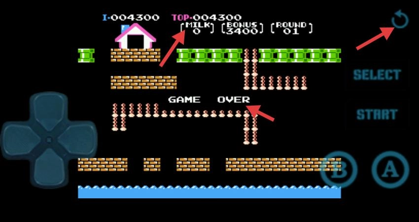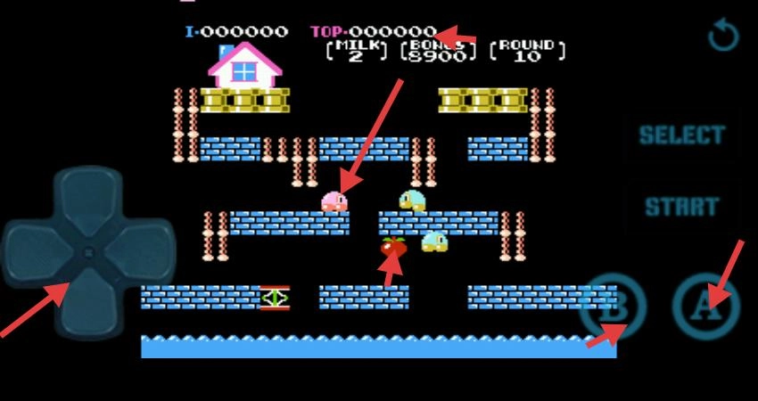 游戏画面里,角色置身砖块场景收集各类物品,界面顶部清晰显示当前分数与关卡信息;玩家通过虚拟方向键操控角色移动,利用A、B键触发动作来躲避怪物、获取水果,整个过程十分考验操作技巧。