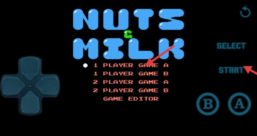 启动界面上显示着“NUTS MILK”的标题,下方依次列出了“1PLAYER GAME A”等游戏模式选项,界面右侧设有SELECT与START两个按钮,玩家可通过它们选定心仪的玩法并开启游戏。