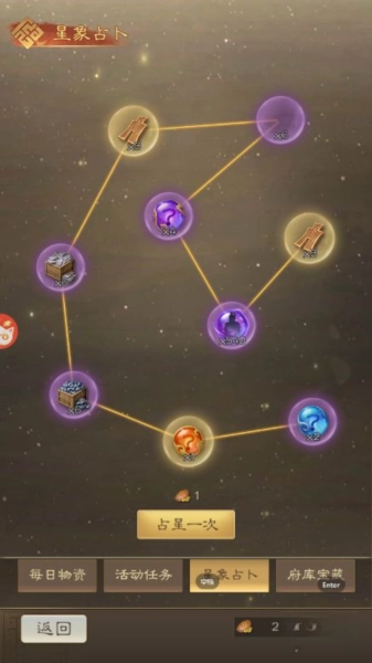 1、每天完成指定任务就能获取「龟甲」「将魂」这类珍稀道具,用龟甲参与占星玩法可以逐步开启丰厚奖励,每一次占星都藏着星辰的奥秘。