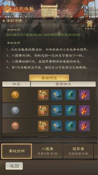 1、赛事结束后,系统会依据最终的排名情况,发放珍稀宝物的培养素材以及各类资源奖励。