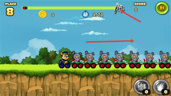 比赛开始后,会遇到一群驾驶车辆的老鼠敌人,需要操控赛车超越它们,与此同时还能看到当前排名、得分等信息。