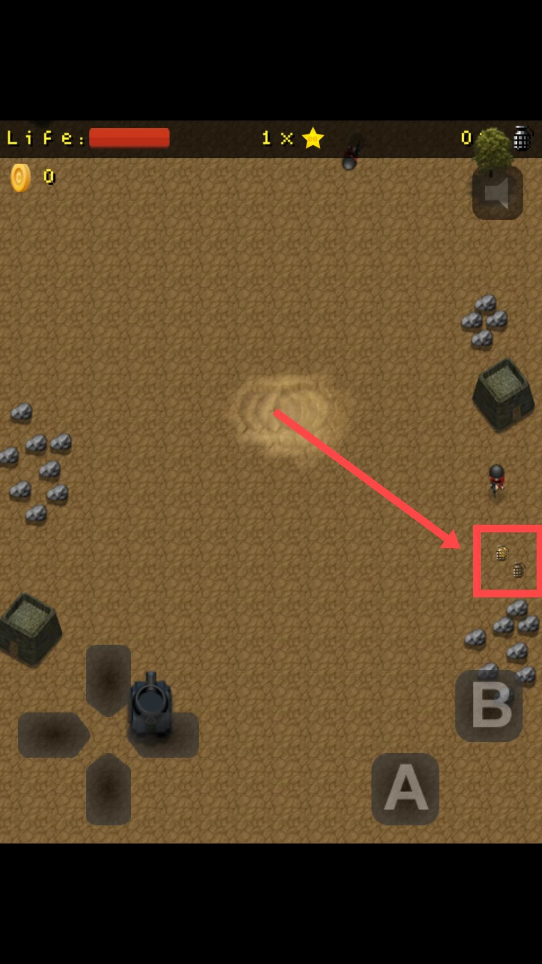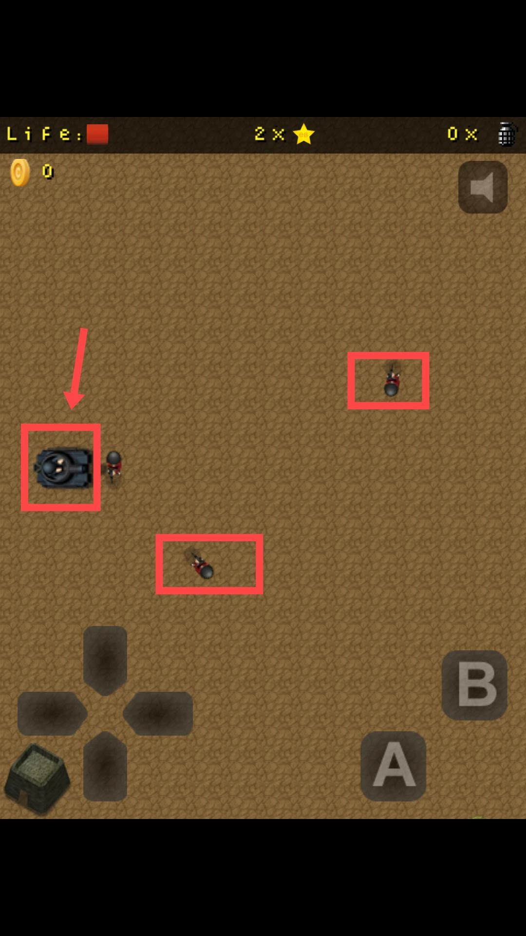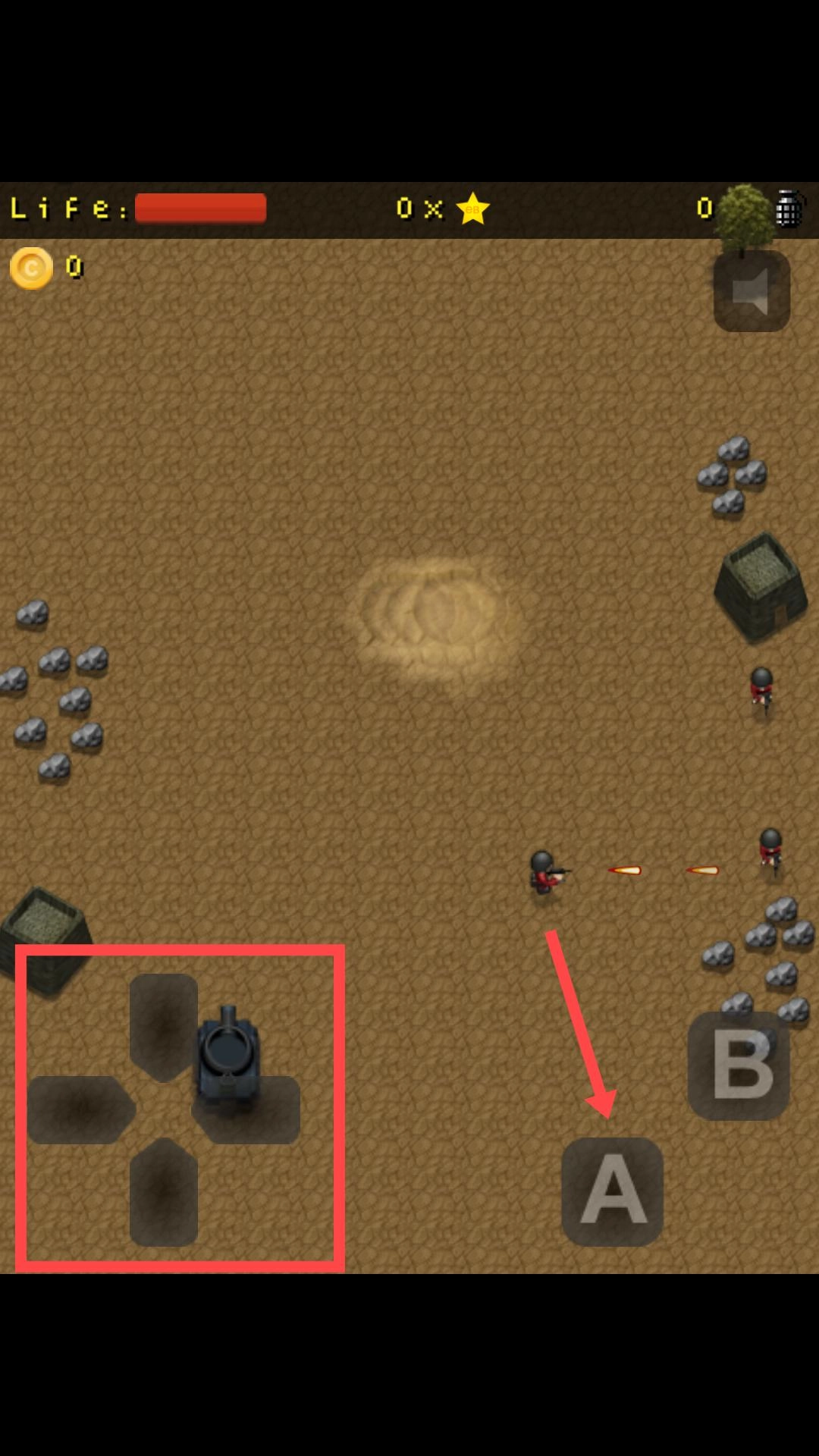 通过左下角的方向键来操控角色移动,点击右侧的A键进行射击,目标是消灭敌人,过程中要留意生命值情况并收集道具。