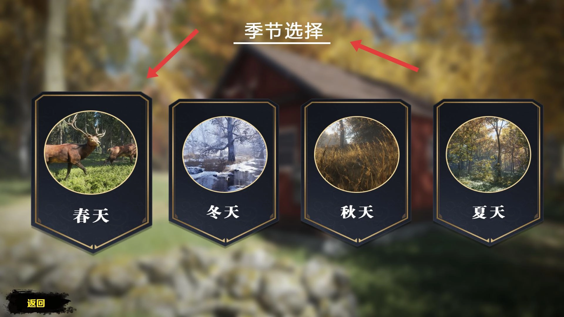 进入季节选择界面后,可从春天、冬天、秋天、夏天这四个季节中挑选其一,选定季节后,便能进入该季节对应的狩猎场景。
