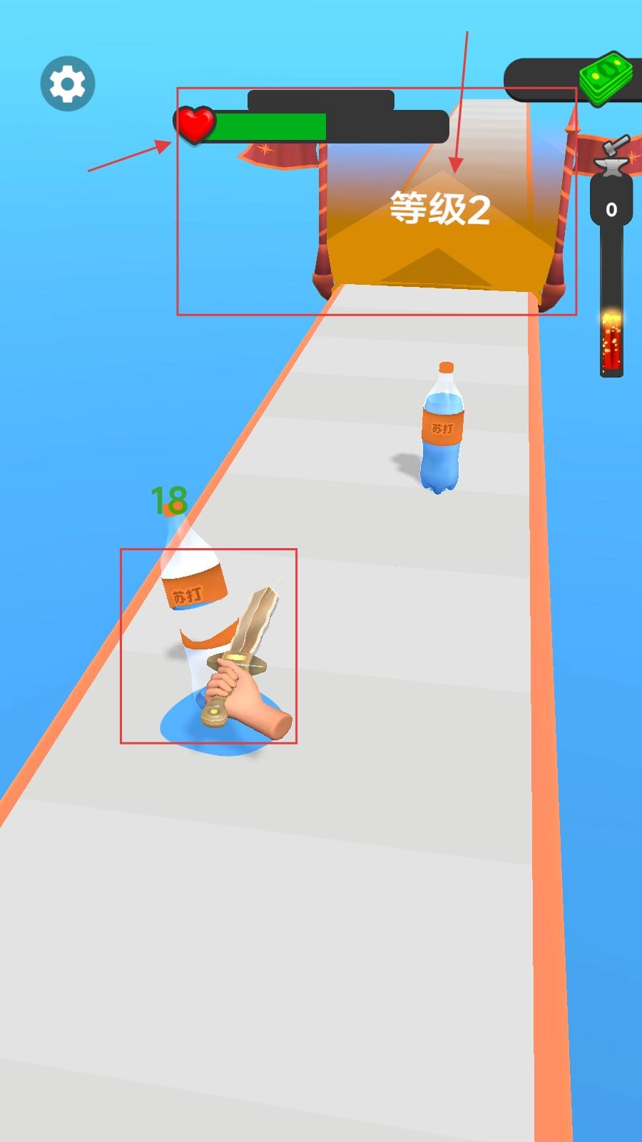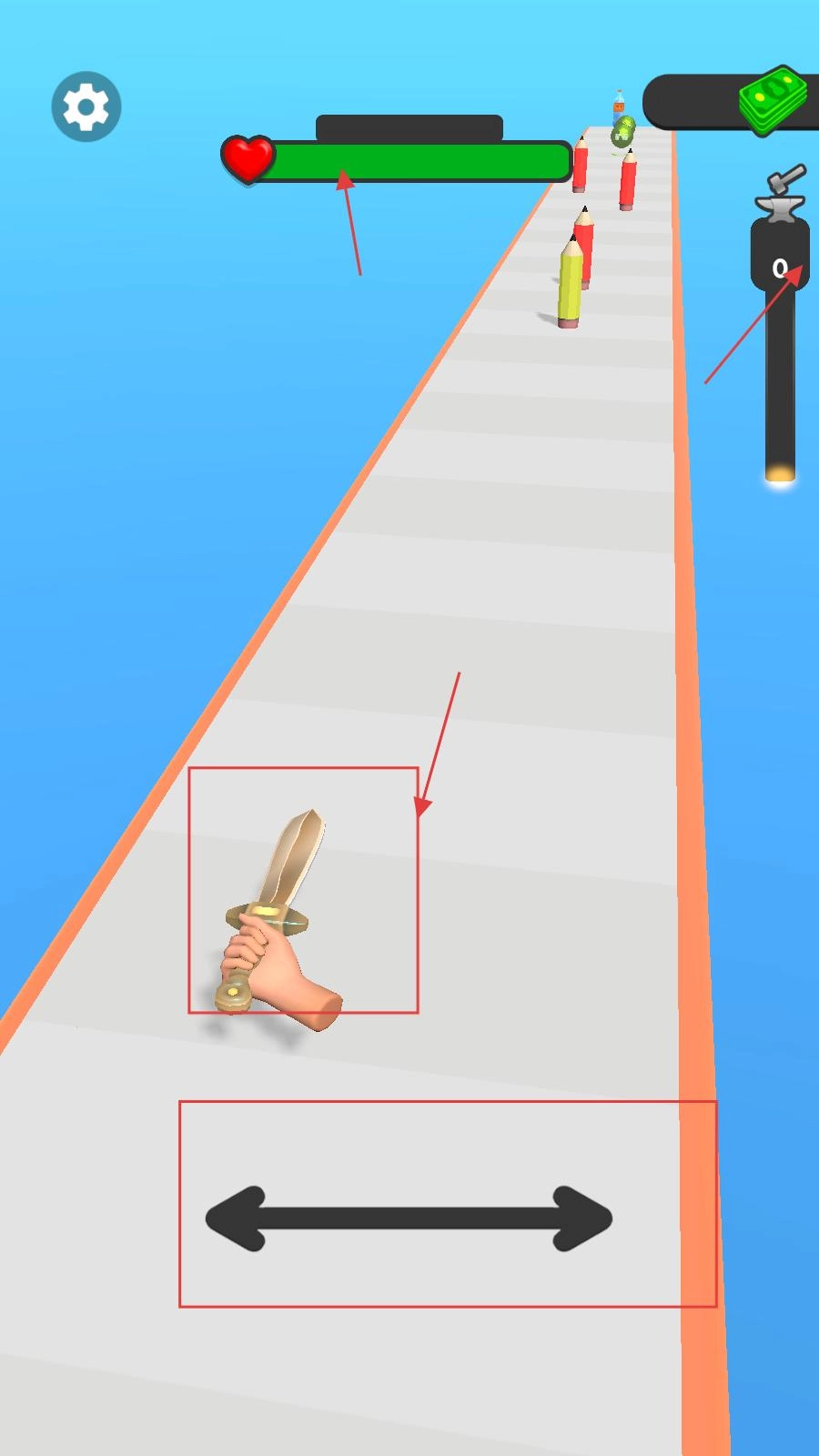 玩家进入关卡后,需通过点击屏幕上的左右箭头来操控宝剑移动,以此切割赛道上的物品,同时要避开障碍物,确保自身的生命值不受损。
