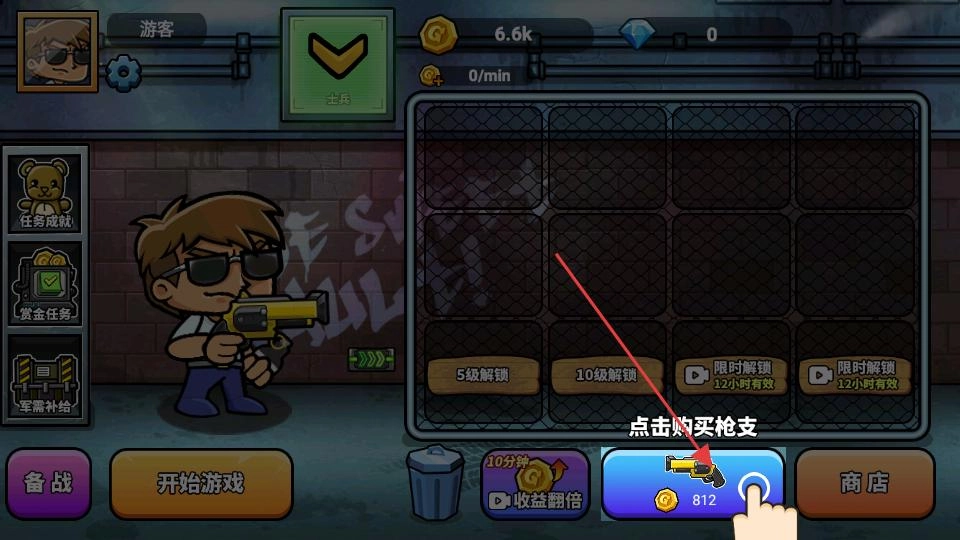 进入主界面后,先查看金币数量,接着点击下方对应的枪支购买按钮,消耗金币即可解锁新枪支;解锁完成后,新枪支会自动替换当前装备,从而提升战斗能力。