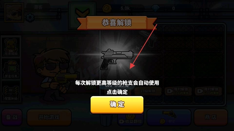 解锁枪支后,会弹出恭喜解锁的提示框,此时需阅读每次解锁更高等级枪支时自动使用的说明,随后点击确定按钮,关闭该提示,即可继续推进游戏流程。