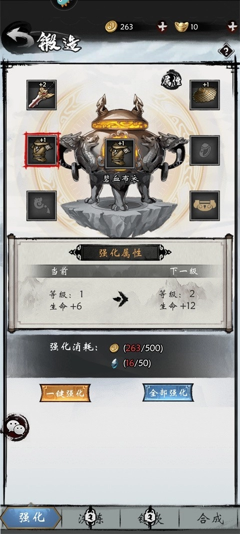 3、若装备材料充足,可一键合成高阶装备;到了后期,还能借助洗炼和镶嵌功能进一步提升装备属性。