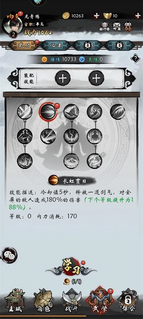 4、然后对武学、心法以及绝进行升级即可