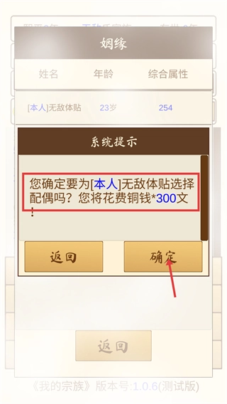 2、当系统提示显示为【无敌体贴】时,选择配偶需要消耗【铜钱*300文】,请在确认自身资源充足后,点击【确定】按钮来完成该操作。