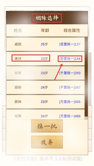 3、进入【姻缘选择】界面后,能够查看【唐诗-23岁】所对应的【综合属性-144】,进而挑选适配的配偶来助力宗族发展。