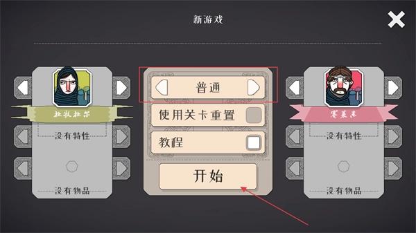 2、在界面中选择角色,把难度设置为普通,勾选教程选项后点击开始按钮,完成初始配置并进入游戏。