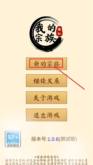 进入游戏后,首先选择【新的宗族】选项。此时请注意界面上显示的【12+-CADPA】适龄提示信息,同时当前游戏版本为【1.0.6(测试版)】。完成上述选择后,即可正式开启宗族模拟玩法。