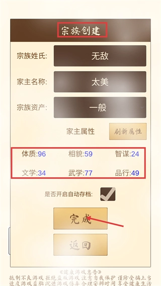 2、发起【宗族创建】操作时,能够确定【宗族姓氏】与【家主名称】,同时可查看【体质:96】【相貌:59】等家主相关属性,确认无误后点击【完成】按钮即可完成宗族创建。