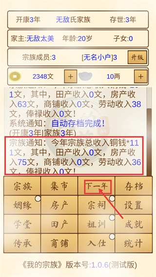 3、进入宗族界面后,会收到【宗族通知】提示总收入为111文铜钱,点击【下一年】按钮推进宗族时间,以此不断扩大宗族规模。