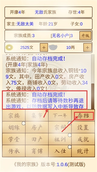 4、进入新年份后,若收到【系统通知】提示自动存档已完成,点击【存档】按钮后,请等待数秒再退出界面,以防数据写入过程中断。