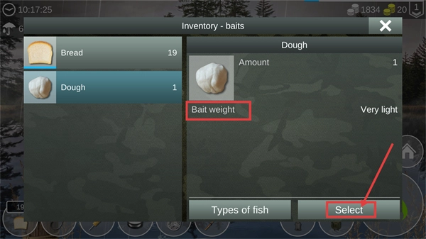 2、进入【Inventory-baits】界面,选中饵料重量为“Verylight”的【Dough】,点击【Select】将其设为当前垂钓使用的饵料。