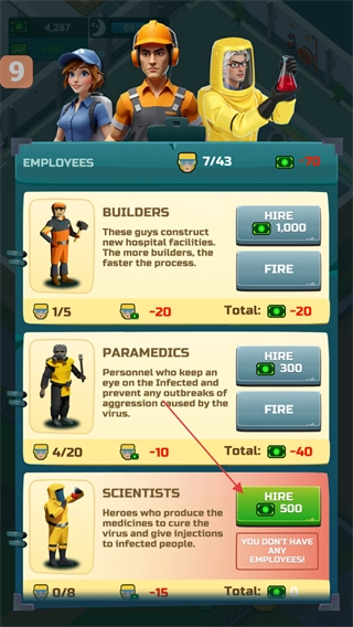 4、进入雇员界面,找到SCIENTISTS选项,点击HIRE按钮招募科学家以助力研发工作。