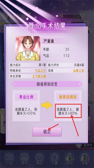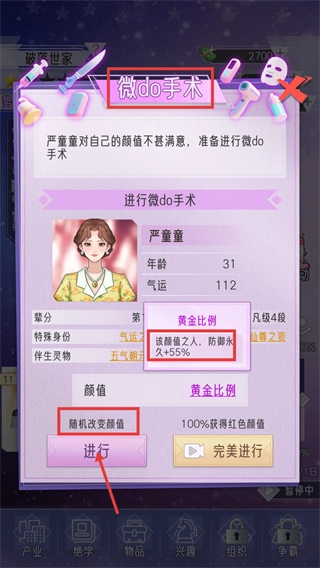1、触发【微do手术】功能时,点击严童童对应的【进行】按钮,会随机调整其颜值;目前该操作关联的是【黄金比例】效果,可使防御属性永久提升55%。