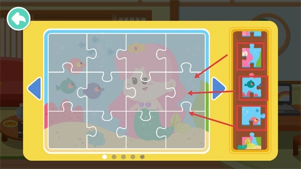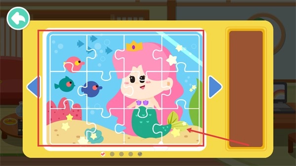 3、挑选右侧相应的拼图块,把它放到左侧拼图区域的对应位置,一步步完成拼图的拼接,推动互动进度。