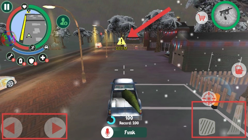 3、驾驶车辆时,利用左侧方向按钮操控行驶方向,借助右侧踏板按钮调节车速,驶向带有距离标识的任务目标位置(例如103M处)。