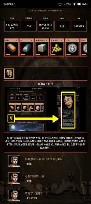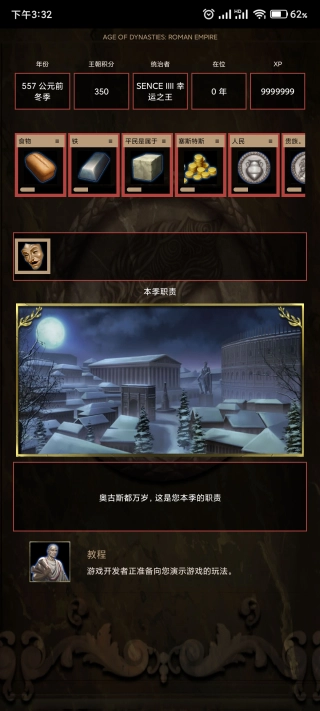 王朝时代罗马帝国是一款以罗马兴衰为背景的回合制策略征服游戏。你将扮演帝国的统治者,在漫长的王朝更迭中执掌权柄,通过平衡内政、应对随机事件、抵御外敌来延续国祚。游戏中每位君主皆有不同个性与能力,是引领罗马走向辉煌,还是目睹其步入衰亡,皆系于你手。
