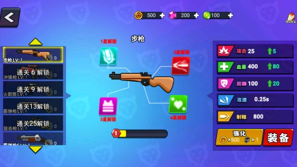 2、利用闯关获得的资源来强化自身的火力配置,提升射击武器的威力和射程,解锁更强大的火力输出手段。