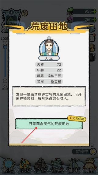 4、【荒废田地】开垦种植灵稻,每月可稳定获得灵石,以此保障修仙家族的日常所需。