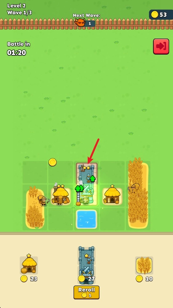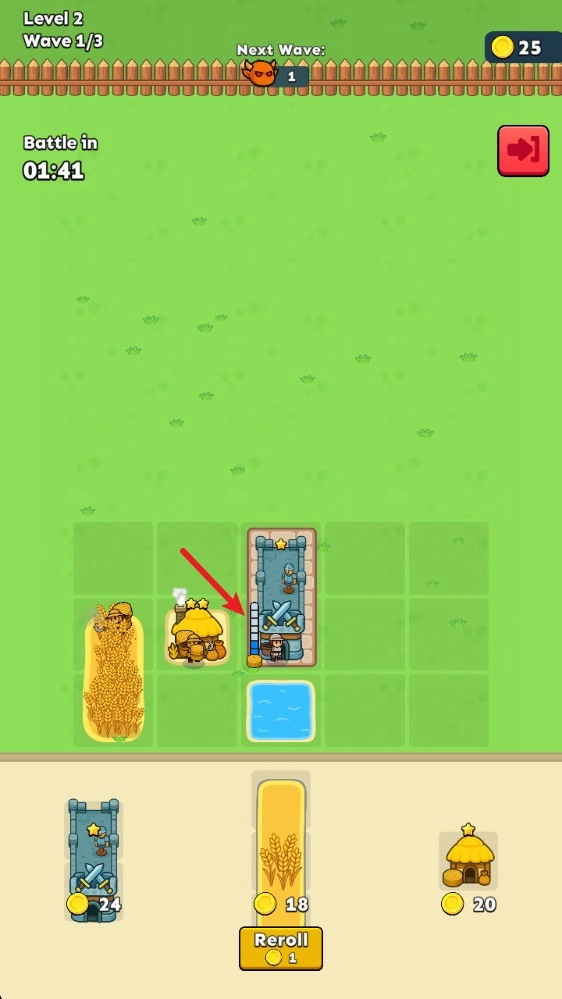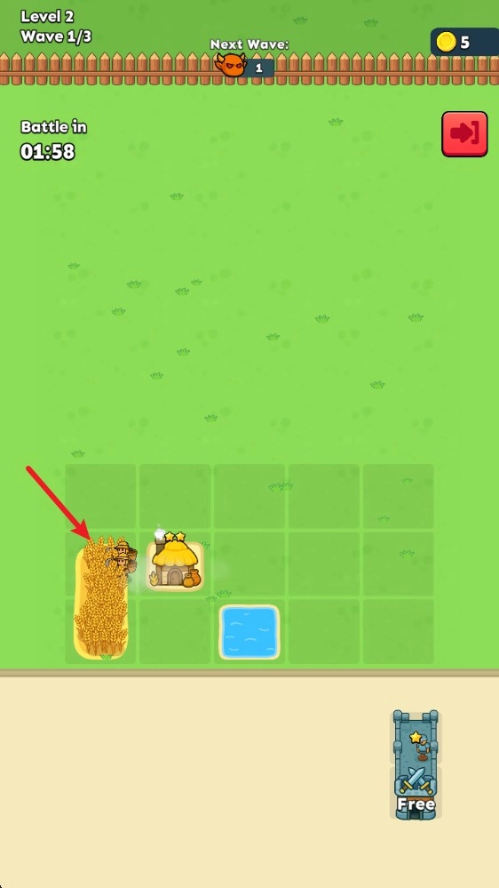 进入关卡后,首先拖动下方的物品,就能将其放置到空格子里。比如像这样放置农场和稻子地,它们就会自动进行开采。
