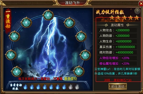 游戏里玩家能够借助渡劫飞升的方式增强角色属性,该游戏总共设有十重渡劫关卡,每一重渡劫都得经受九道雷劫。要是某次渡劫失败了,下一回渡劫时雷劫的数量就会减少一道。雷劫存在十种不一样的类型,它们带来的伤害也各不相同,玩家每次渡劫遇到的雷劫都是随机出现的。
