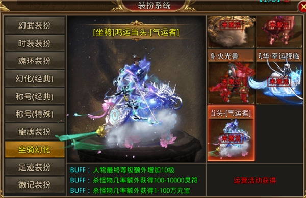 装扮系统涵盖的种类样式十分丰富,有幻武、时装、魂环、称号、坐骑、足迹等多个品类,每个品类都有多元化的款式,总有一款能让你倾心。