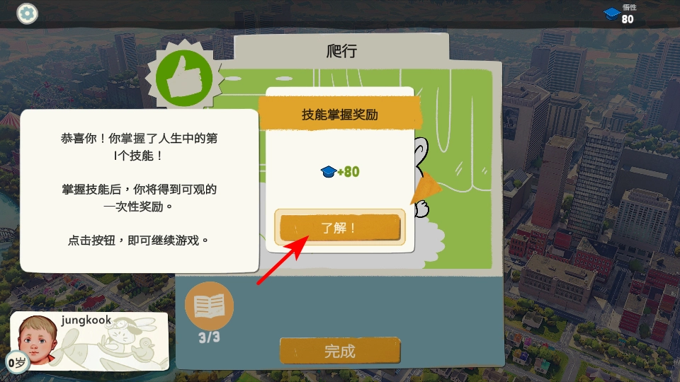 当你成功掌握一项技能后,点击“了解”按钮即可领取技能掌握奖励,例如悟性值。这些奖励能用于学习新技能,帮助角色持续成长。