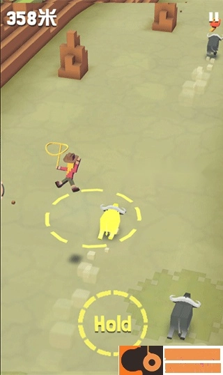 游戏开始的画面里,角色会骑着小野牛,套索在手,在地面上奔跑。长按画面不松开,等和前方动物距离较近时,向前滑动一下,就能瞬间跳过去。