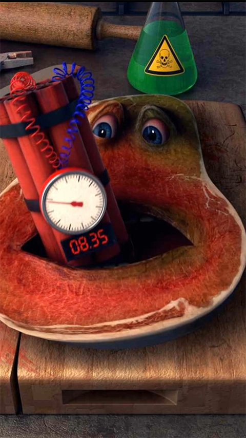 视觉与氛围设计方面,画面运用简洁而独特的美术风格,色彩明快且具备丰富的层次感。牛排那夸张的神情与动作,像瞪眼、吐口水之类,再搭配上荒诞的音效,共同构建出一种既诙谐又稍带惊悚感的沉浸式氛围。