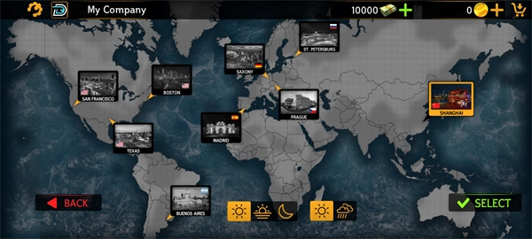 你可以挑选自己想去的地区,游戏里包含多种现实中的城内与城外地图,像美国的旧金山、德克萨斯,南美洲的布宜诺斯艾利斯,欧洲的德国、西班牙、布拉格、圣彼得堡,还有迪拜、上海等地;同时能在下方选定当前地区一天里的不同时段和天气状况,最后点击SELECT按钮就行。