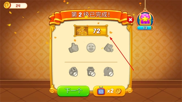 成功闯过关卡后,不仅能得到金币之类的奖励,还会看到关卡通关的提示,并且可以选择进入下一关继续游玩。