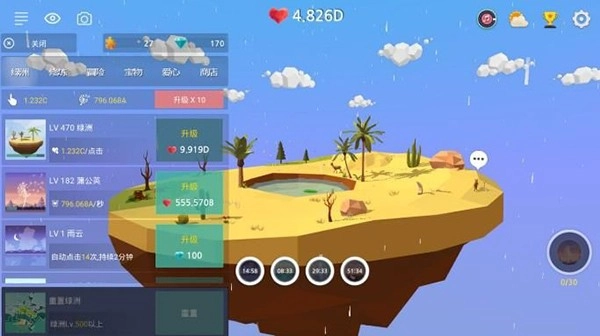 清新的3D画风勾勒出一片绿洲,将荒芜的沙漠转化为生机盎然的绿洲。游戏中清新治愈的画风与舒缓的音乐相得益彰,还加入了天气系统,让游戏体验更加变幻莫测。放置玩法完美适配碎片化时间,每次解锁新的动植物都能带来满满的惊喜,让玩家尽情感受游戏的乐趣。