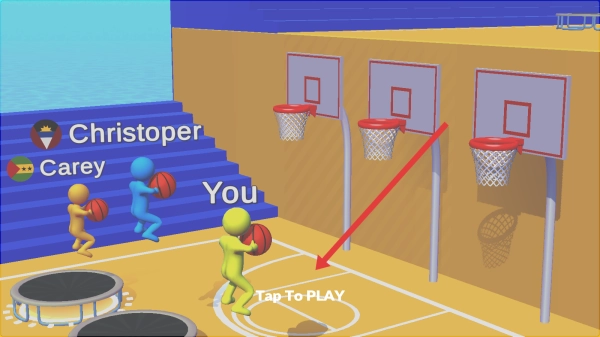 点击场地上“Tap-To-PLAY”的按钮,就能开启和Christopher、Carey的篮球对决啦。记得借助蹦床这类场地设施,来展开一场充满趣味的投篮竞赛。