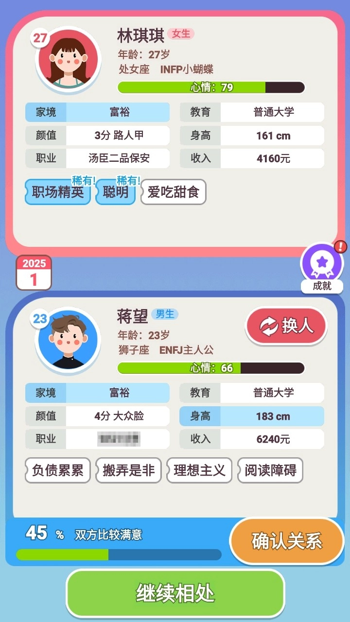 从呱呱坠地到垂垂老矣,亲历人生的跌宕起伏。玩家能够凭借选择各异的职业方向、教育路径、情感联结与生活模式,雕琢出角色独有的人生脉络。游戏里的每一次抉择,都或许催生不一样的结局,左右着角色的幸福指数、财富积累以及社会层级。不仅如此,玩家还可以建立家庭,孕育子嗣,见证家族血脉的薪火相传。