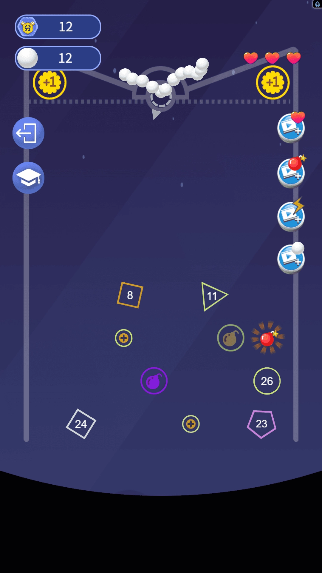 3、击碎特殊砖块可解锁增益道具,能达成增加小球数量、扩大弹射范围等效果,借助密集弹射可快速清理砖块,助力突破关卡瓶颈。