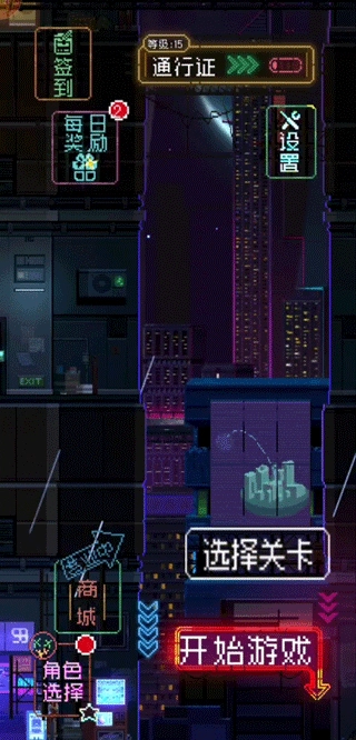 1、赛博朋克风像素都市,在音乐的律动里开启节奏冒险与战斗之旅。
