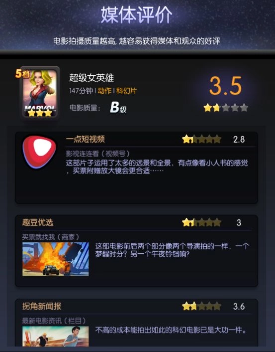 要是这里面没有合适的剧本想拍摄,可以点击左上角的「刷新」按钮来更新剧本。剧本有星级之分,星级范围是1到4星,星级越高,能够上阵的角色数量就越多,电影的上限值也会相应更高。