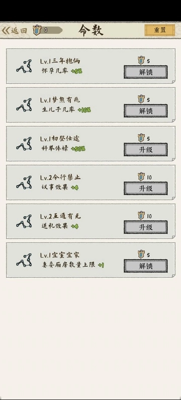 命数:花费命数点解锁和升级命数,每局可继承,可以按需选择,目前看来作用不大。有点数分配的情况下按钮亮起,无点数可分配时是灰色。可重置,点击右上角重置后可以重新分配。