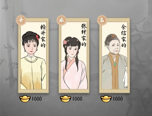 这里展示你现有的妻妾,你能看到她们的名字(像和氏、熊氏这类)以及立绘。左上角会显示她们的总数和每月所需的总费用,每位妻妾每月的花费是1000金。