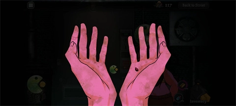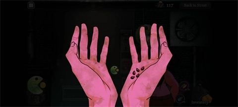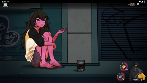 场景氛围:玩家化身的流浪女孩会在午夜星空笼罩的街头盘腿静坐乞讨。游戏构建出寂静中透着诡异的氛围,街头的环境与过往的行人都满是不确定性。