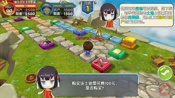走到空白格子就能选择购买土地,抓紧拿下它吧!等其他玩家走到这个格子,就得向你交过路费啦。