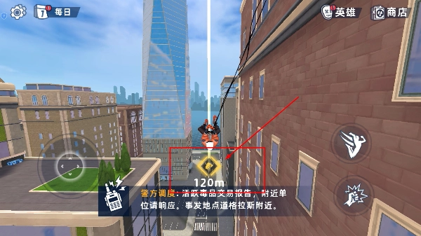 1、操控蜘蛛侠用蛛丝在高楼间移动,关注【120m】标识与警方调度信息,按提示进行移动至目标处。