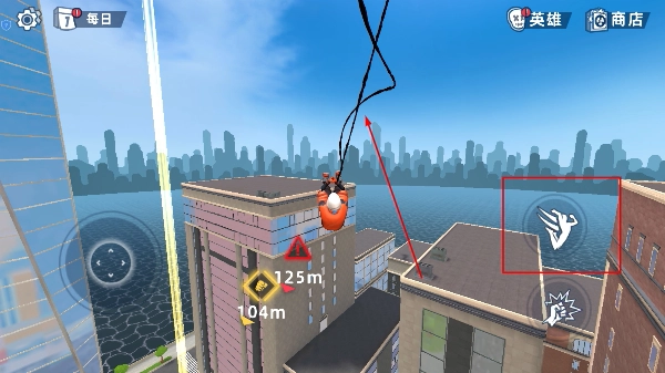 2、利用蛛丝穿梭城市时留意距离标识,借助手势图标调整移动方向躲避障碍。