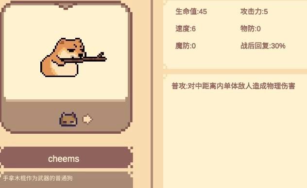 cheems:普通攻击能够对中距离范围内的单个敌人造成物理伤害。达到2星时,会对身前一条直线上的敌人产生击退与减速效果。升至3星后,技能1可对身前一条直线上的敌人造成击退和减速;技能2则会每隔一段时间随机向一名敌人施加恐惧状态。